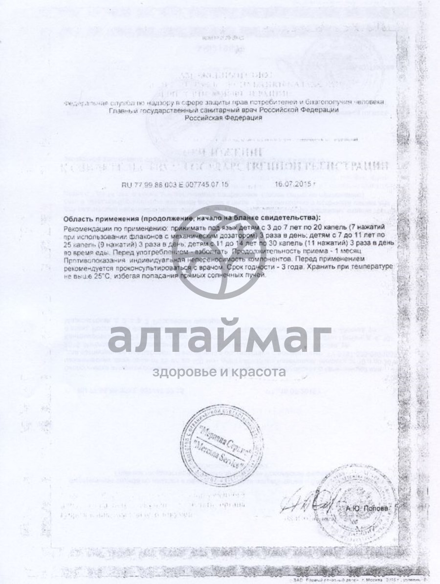 Перед употреблением взболтать. Принимать детям старше 5 лет под язык по 5-20 капель (или 2-6 нажатий на дозирующее устройство флакона) 3 раза в день во время еды. Рекомендуемая длительность курса – 1 месяц.