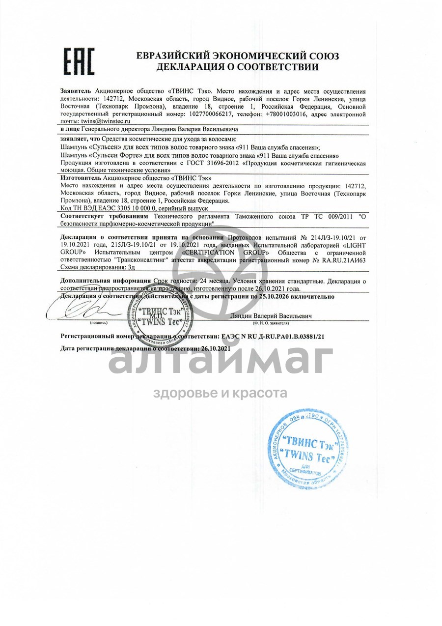 Шампунь «Сульсен Форте» для всех типов волос товарного знака «911 Ваша служба спасения» оказывает отшелушивающее действие.
